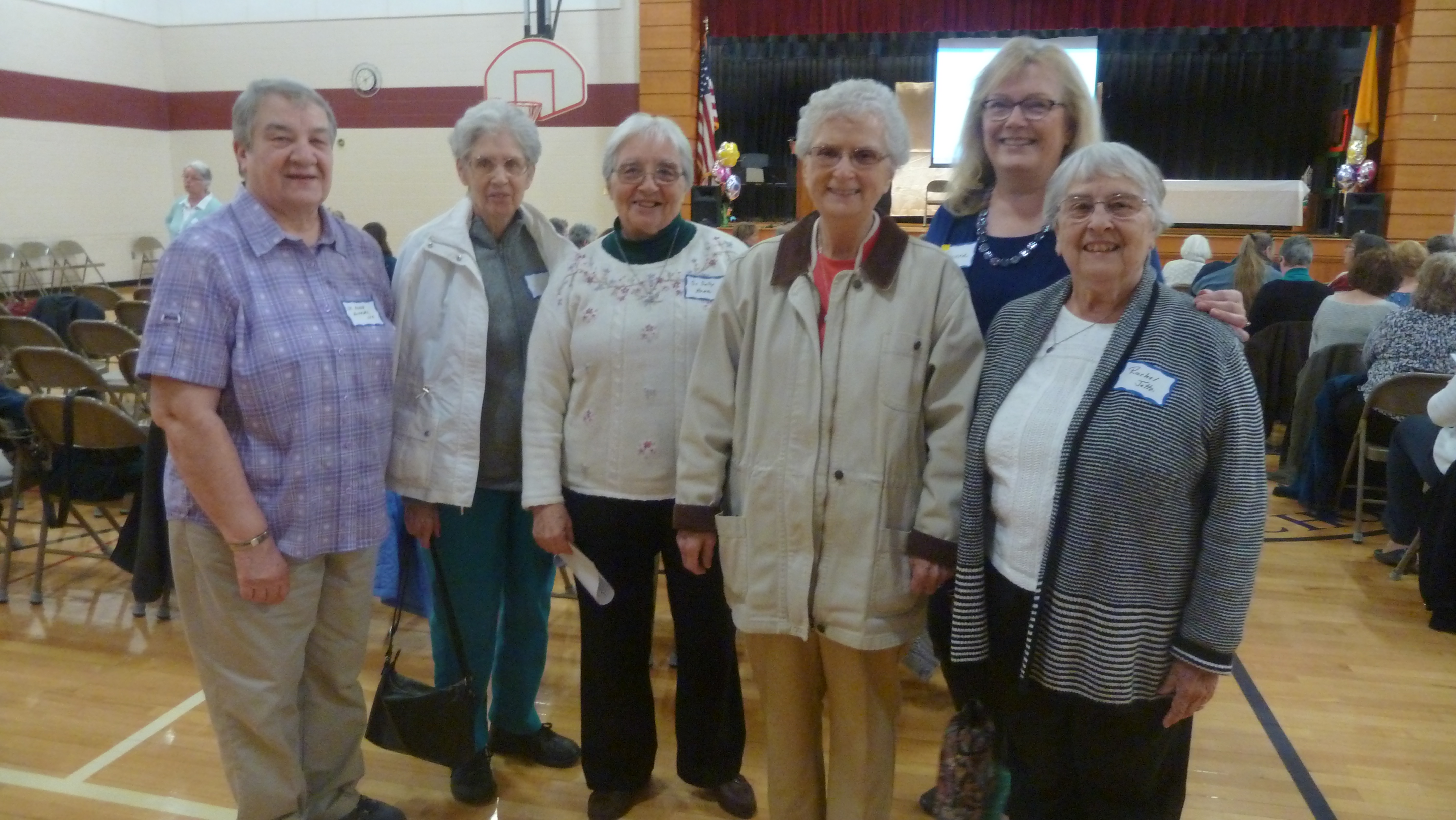 L/R Sisters of the Holy Cross: Anne Hoffler, Theresa Auclair, Sally Ann Howe, Elaine Theoret, and Rachel Jette. Standing just behind the Sisters at the far right is Donna Plourde, Executive Director at Real Life Giving, a nonprofit organization committed to combating sex trafficking and exploitation in New Hampshire.